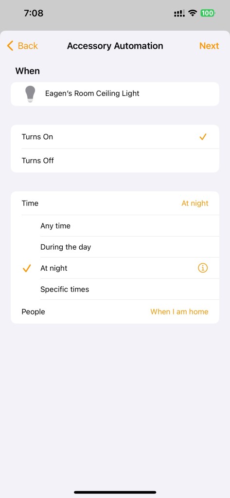 最基本的設定大概就是時間、日出日落、平日週末等時間相關的設定;除了這些之外,還可以針對使用者的狀態,像是:在家、外出、回家等各種狀態來進行設定,如果家庭成員不只一人,也可以判斷第一人到家或是最後一個人離開的狀態,這些就牽涉到使用者的手機定位功能,像是在 iPhone 來說,你必須允許傳遞定位資料到 iCloud 上;再來就是透過設備的開關狀態、感應器的狀態等來執行,像是開燈的同時關閉窗簾,或是偵測到門打開時亮起小燈5分鐘。