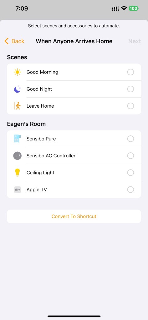 Good Morning 是我自己設置的情境之一,這個情境可以直接當作一個按鈕或是指令來執行你所想執行的自動化功能,但是在 Apple Home 裡面,情境只能設定設備的開關跟狀態,不具有判斷「事實」的功能,所以我簡單的設定了一個 Good Morning 來關閉一些電器,像是:空氣淨化機、燈之類的,這樣我就可以透過自動化功能,到早上 7:30 自動執行 Good Morning,幫我關閉那些電器。甚至之後裝了智慧窗簾之後,還可以設定自動打開窗簾。